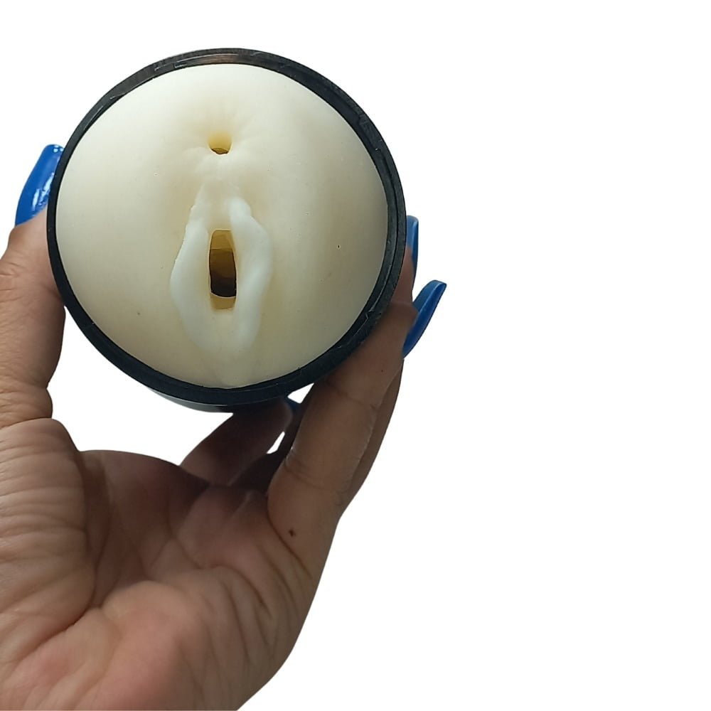 Masturbador em formato de copo com design de diamante na ponta, possui dois orifícios penetráveis (vagina e ânus) e textura interna realística.